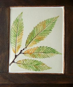 Our leaf tiles are made from fresh leaves picked and pressed into soft clay. When dry the tile is fired, the leaf burns away leaving an impression in the clay. The tile is then hand coloured, glazed and fired again before being mounted in one of our reclaimed wood frames.